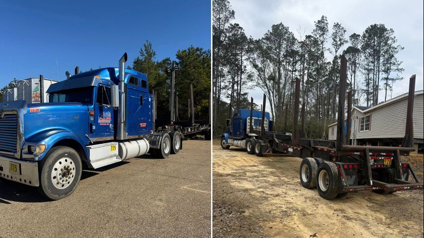 B.J. Ginn Trucking posted the images to Facebook, saying that the stolen vehicles are a 1999 International Eagle and a 2005 Pitts log trailer.