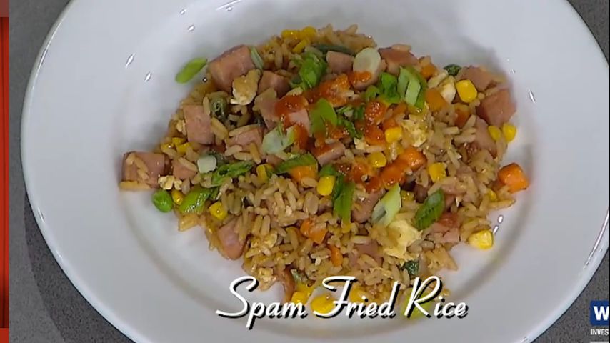 Heat remaining 1 tablespoon vegetable oil in the skillet over medium high heat. Add garlic and Spam, and cook, stirring often, until light golden brown, about 3-4 minutes.
