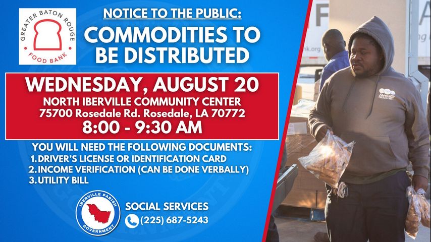 According to the parish government, people can get commodities at the North Iberville Community Center at Rosedale Road from 8 a.m. to 9:30 a.m.