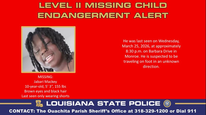 MONROE - Louisiana State Police have issued a Level II Missing Child Advisory for a 10-year-old in Ouachita Parish.