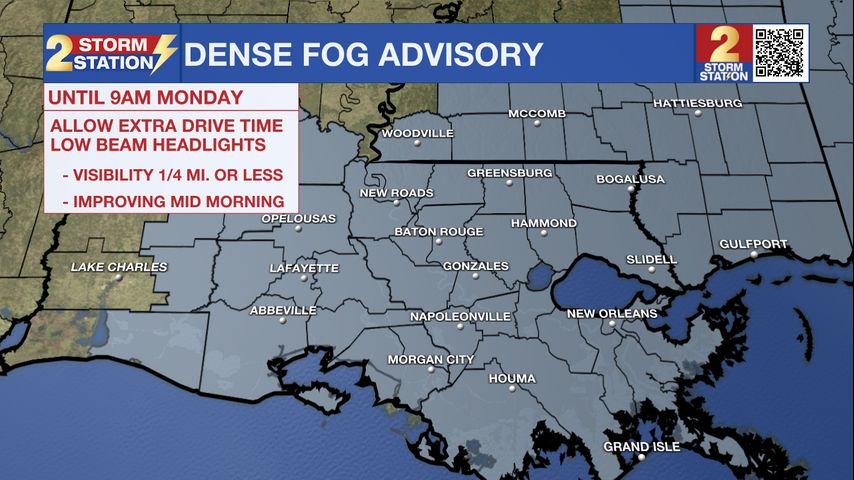 Dense fog could be a problem for commuters on Monday morning. Highs will stay well above normal as storm chances increase later in the week. South Louisiana continues in a much warmer-than-normal pattern to start the new week. High temperatures will climb into the 80s again on Monday, with increasing humidity and nightly fog remaining possible.