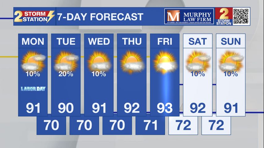 Labor Day and Tuesday: The front that kept things unsettled most of last week is still drifting southward into the Gulf waters. Showers near the coast could hamper boaters. The rest of the region can expect partly cloudy skies with highs near 90. Winds will be light. Heading into the new work week, a weak front will drift southward. This could spark one or two showers. After, another push of dry air should keep us rain free by the end of the week.