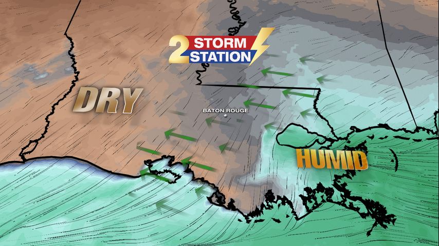 Tonight & Tomorrow: The refreshing feel will remain through most of the night with dry air remaining in place. Lows will dip into the mid-60s again for many, with a few spots mainly north of I-12 sneaking into the low 60s. But the dry air will be hanging on by a thread. Moisture will begin creeping in during the morning, with areas east turning muggy sooner. By late afternoon, it will feel muggy (even downright humid) across most of the area. The boost in moisture will contribute to a spotty storm chance, though most will stay dry. Look for a high temperature near 90°.