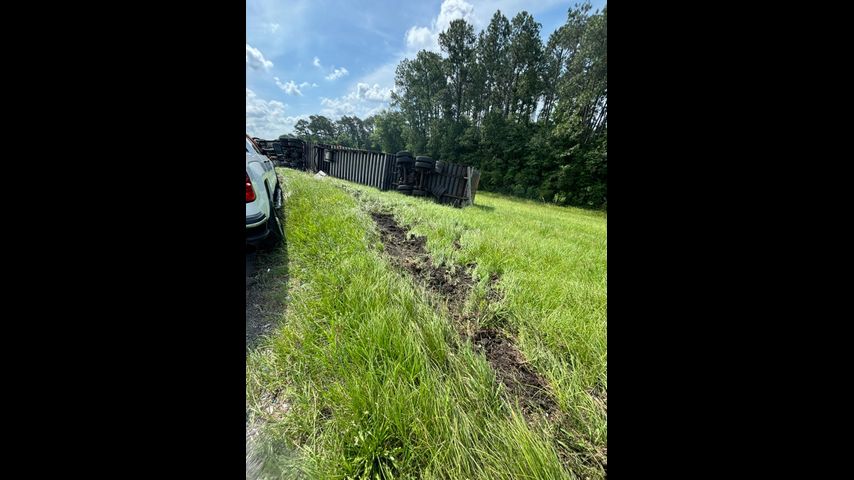 The 18-wheeler left the roadway and overturned around 9:49 a.m., with Hammond Fire and Hammond Rural Fire officials responding. No injuries were reported, officials added.