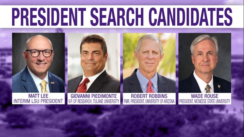 The search committee will meet with interim LSU president Matt Lee, Dr. Giovanni Piedimonte of the Tulane School of Medicine, former University of Arizona president Dr. Robert Robbins and McNeese president Wade Rousse. Piedimonte and Robbins are medical doctors; Lee and Rousse hold Ph.Ds.