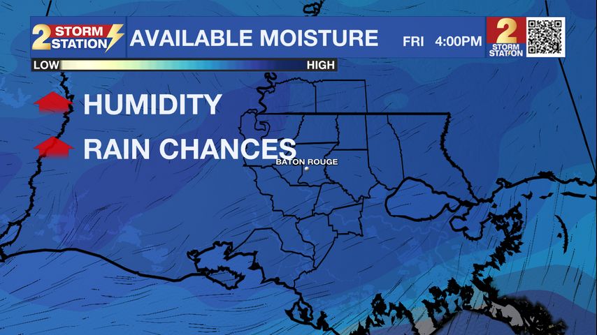 Up Next: Winds will flip back out of the south Thursday, allowing higher moisture values to move into the region. This will cause a few more clouds, and greater humidity values. Temperatures will climb into the low to mid-90s, but the chance for rain stays slim—just a brief, stray shower possible mainly south of I-10. By Friday, available moisture increases even more, as a disturbance and front slides down from the northwest. Scattered showers and thunderstorms will be the result, so keep this in mind if you have plans.
