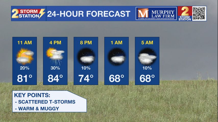 Today & Tonight: This morning, expect muggy conditions with a few sprinkles possible. Jackets will not be needed, but make sure to bring an umbrella with you for later today. Showers, and a few storms will first begin to fire by the noon hour, and last through the evening. Scattered activity is expected, with about 50% of the 13 parish, 2 county wide viewing area picking up measurable rainfall. This means not everyone will see rain, and most should find a lot of dry time. Highs will reach near 86 degrees under a mix of sun and clouds. Overnight, rain will taper off, with lows settling near 67 degrees.